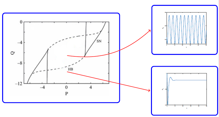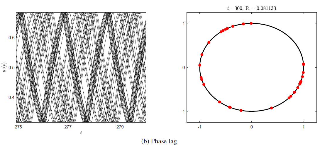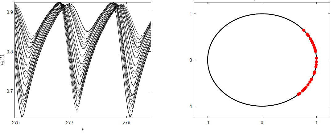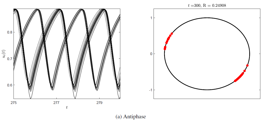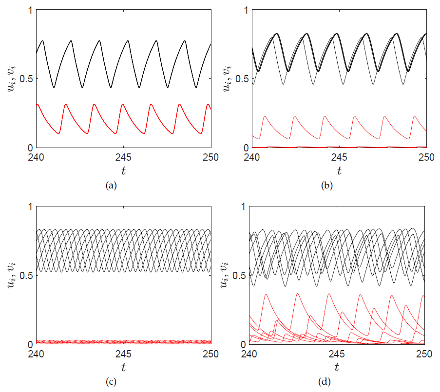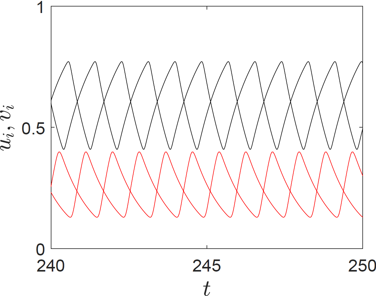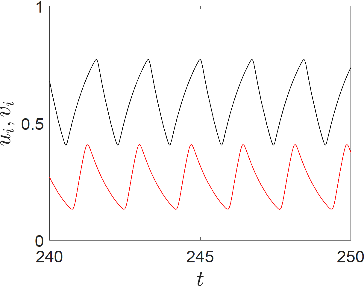 \[\begin{align*} \frac{\mathrm{d}u_i}{\mathrm{d}t} &= -u_i + \phi\left(au_i(t-\tau)+bv_i(t-\tau)+P+\epsilon\sum_{j}w_{ij}u_j(t-\rho)\right) \\ \frac{\mathrm{d}v_i}{\mathrm{d}t} &= -v_i + \phi\left(cu_i(t-\tau)+dv_i(t-\tau)+Q\right), ~i=1,\ldots,n \end{align*}\]