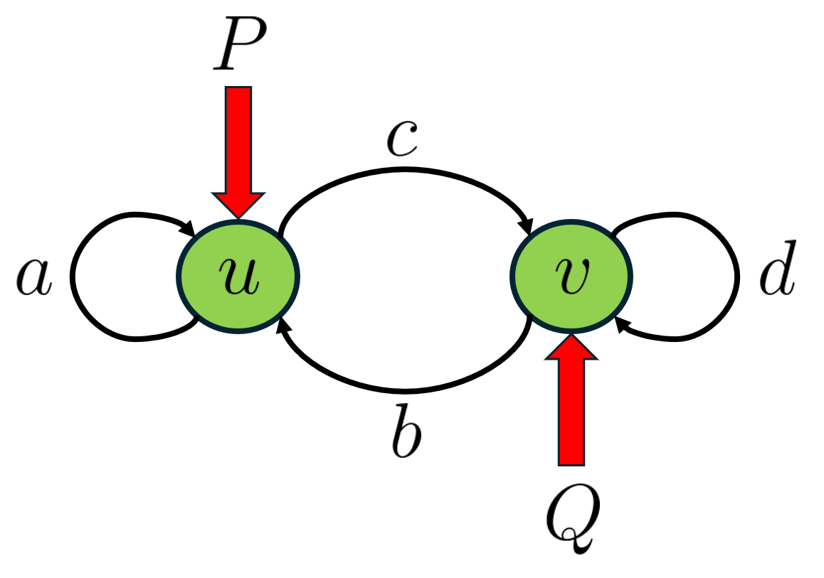 \[\begin{align*} \frac{\mathrm{d}u}{\mathrm{d}t} &= -u + \phi\left(au(t-\tau_1)+bv(t-\tau_2)+P\right) \\ \frac{1}{\alpha}\frac{\mathrm{d}v}{\mathrm{d}t} &= -v + \phi\left(cu(t-\tau_2)+dv(t-\tau_1)+Q\right) \end{align*}\]